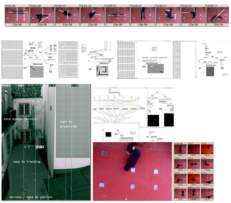 Apropiación de un espacio arquitectónico a través del cuerpo en movimiento. Ejercicios de obra, fue pensado específicamente para este lugar como ejercicio final del proceso de residencia / aprendizaje en programas interactivos en tiempo real Max / Msp / Jitter .Las tecnologías aquí se utilizan, se manipulan o se re-ubican en lo que llamo en mi proyecto «Formatos Híbridos» y que apela a la creación de trabajos interdisciplinarios, en los que convergen distintas estrategias, operaciones conceptuales y estéticas.