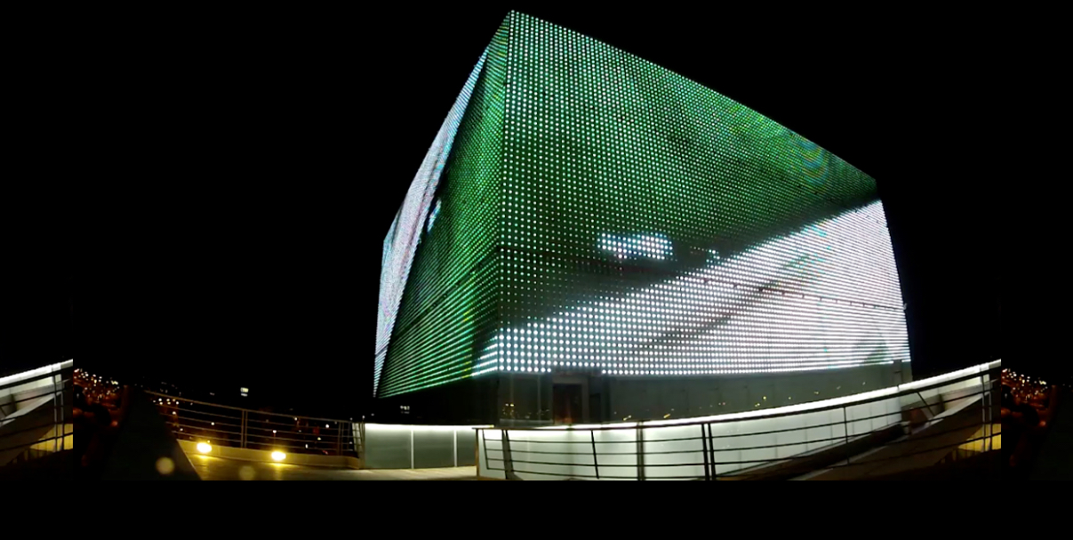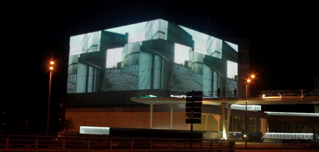 Inicialmente se exploraron las propiedades de la fachada tanto en su estructura arquitectónica como las posibilidades técnicas de la pantalla. A través de acciones corporales en distintos espacios de eTopia, se exploraron relaciones de escala, líneas y planos intentando encontrar diálogos visuales. Entonces se trabajó con la idea de amplificar la arquitectura propia del edificio y del mismo modo experimentar sobre la idea de cubo y plano, para revertir visualmente la estructura arquitectónica.